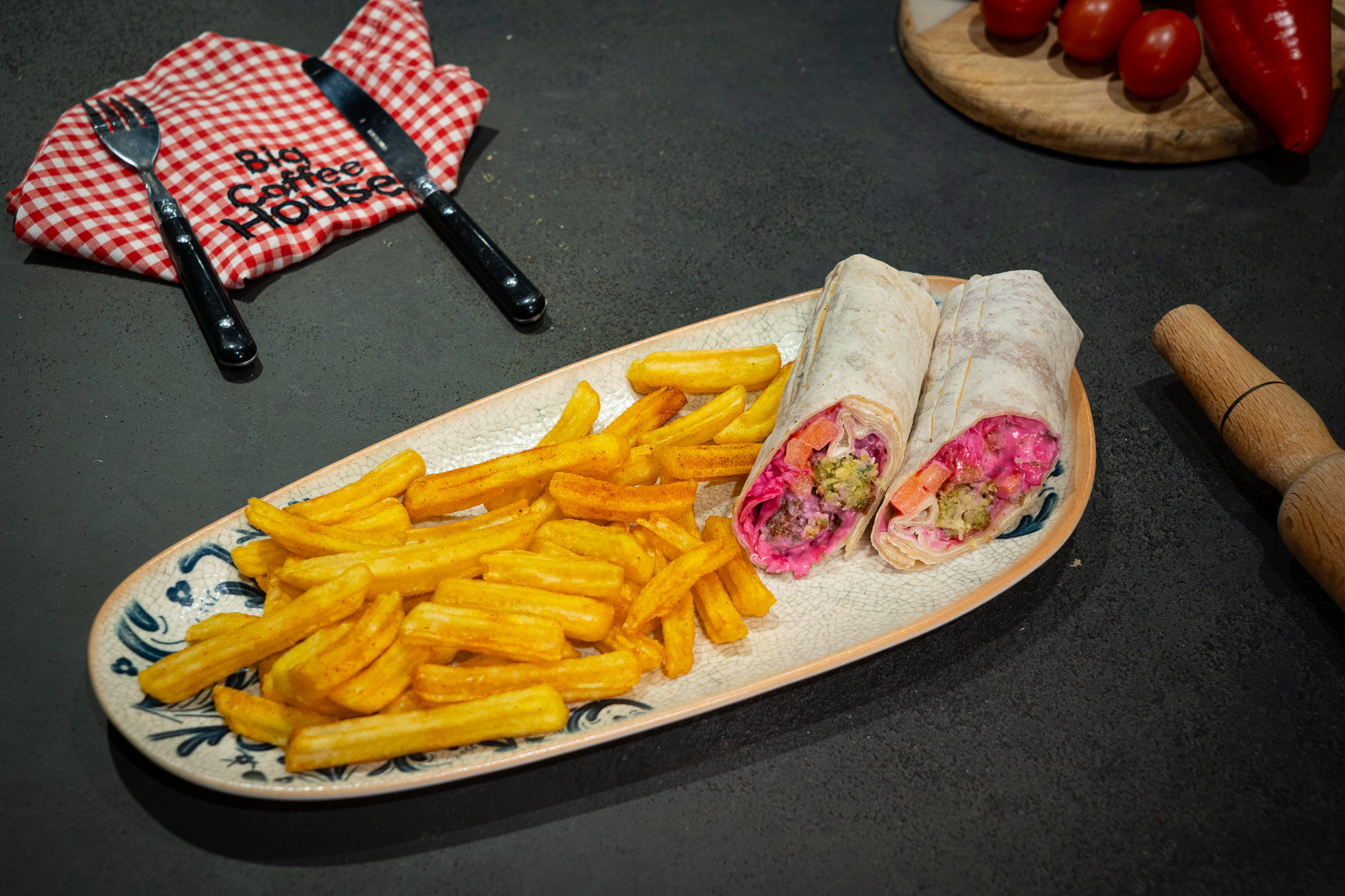 Tortilla Ekmeğine Sarılmış Falafel Köfte, Mor Lahana Coleslaw, Domates, Yanında Patates Kızartması ile Servis Edilir