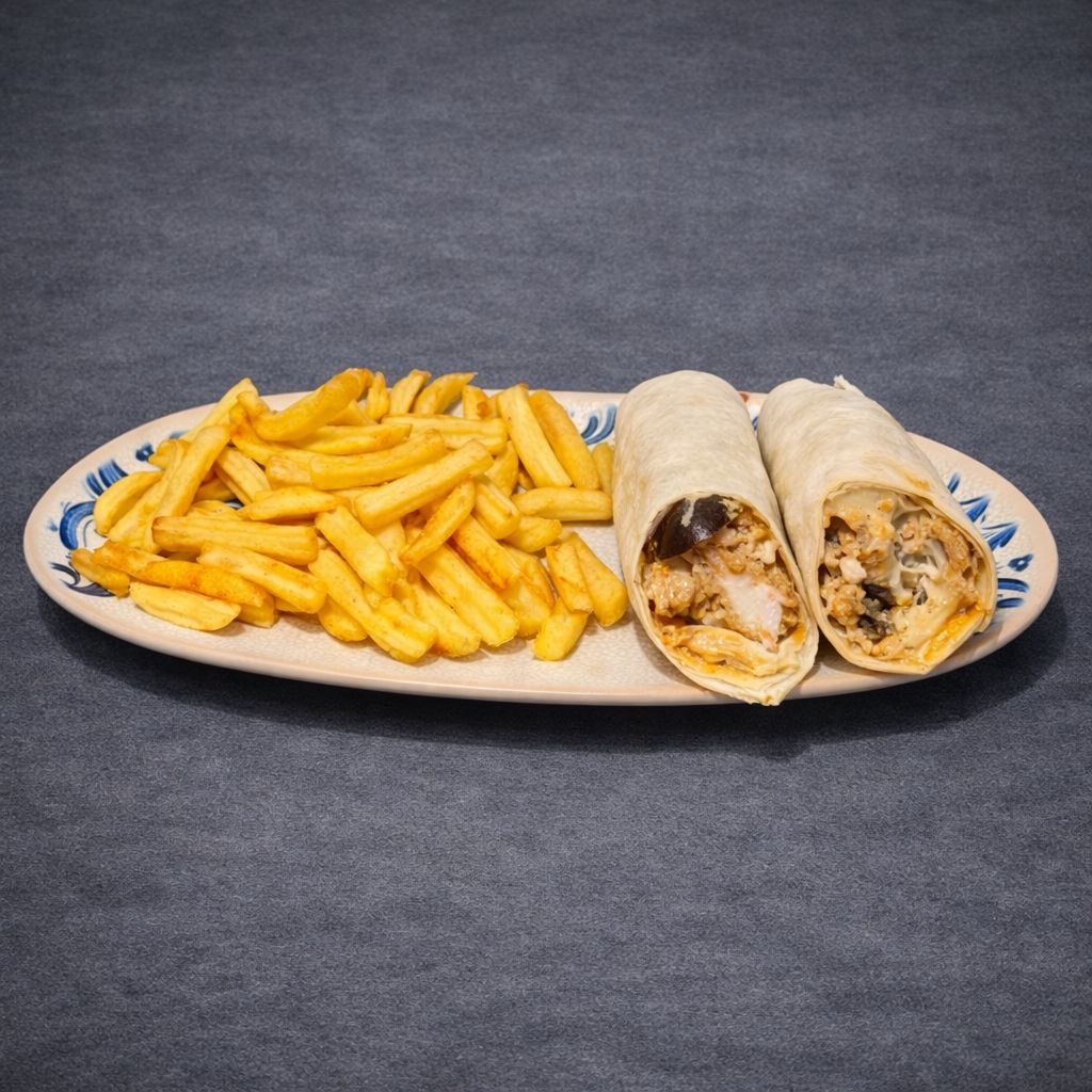 Tortilla, çıtır jülyen tavuk, sarımsaklı yoğurtlu közlenmiş patlıcan, patates kızartması ile.