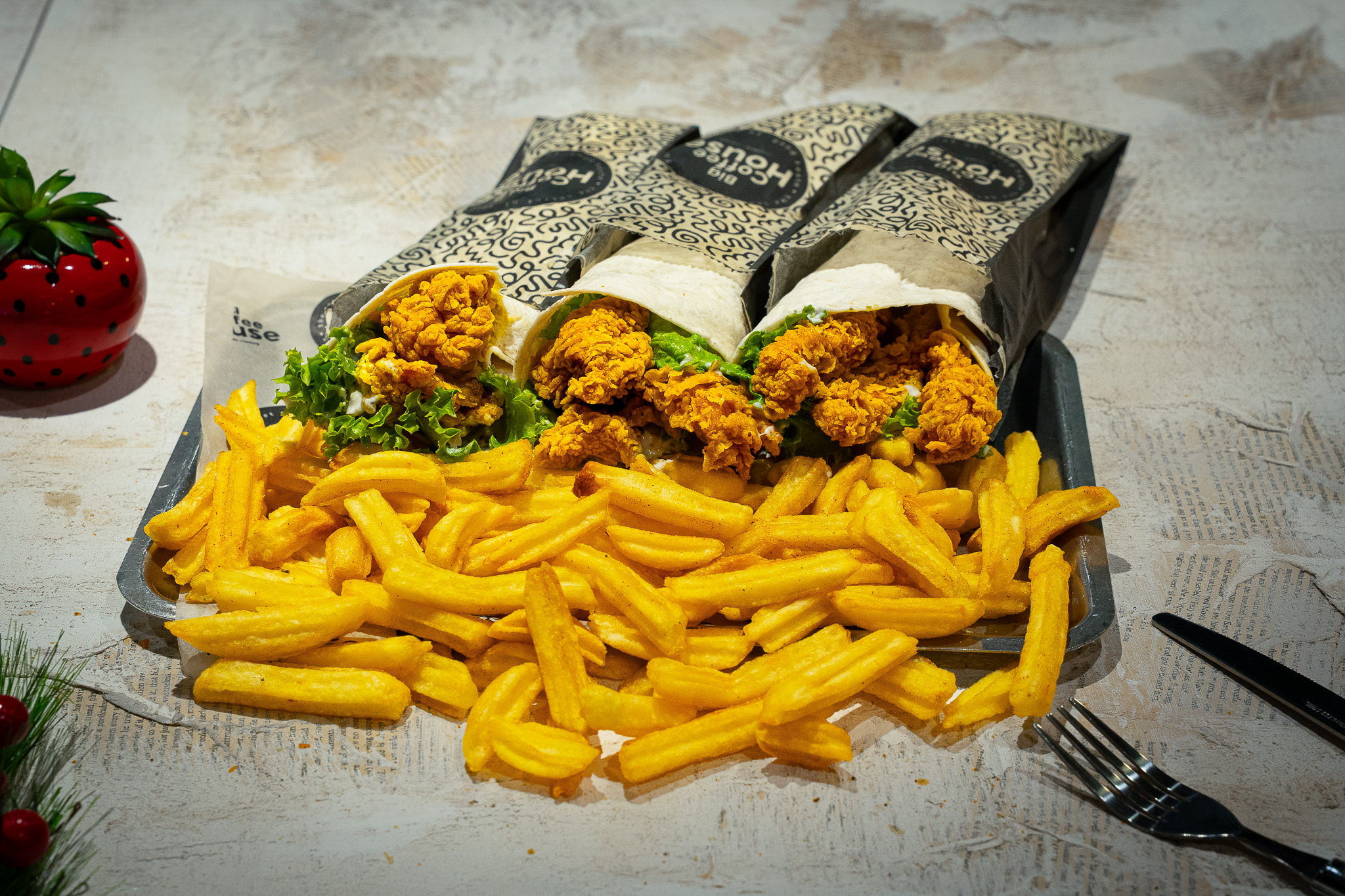 Izgara tavuk bonfile, kibrit patates, domates, sarımsaklı mayonez, acılı ketçap, marul, patates kızarması ve akdeniz yeşillikleri ile.