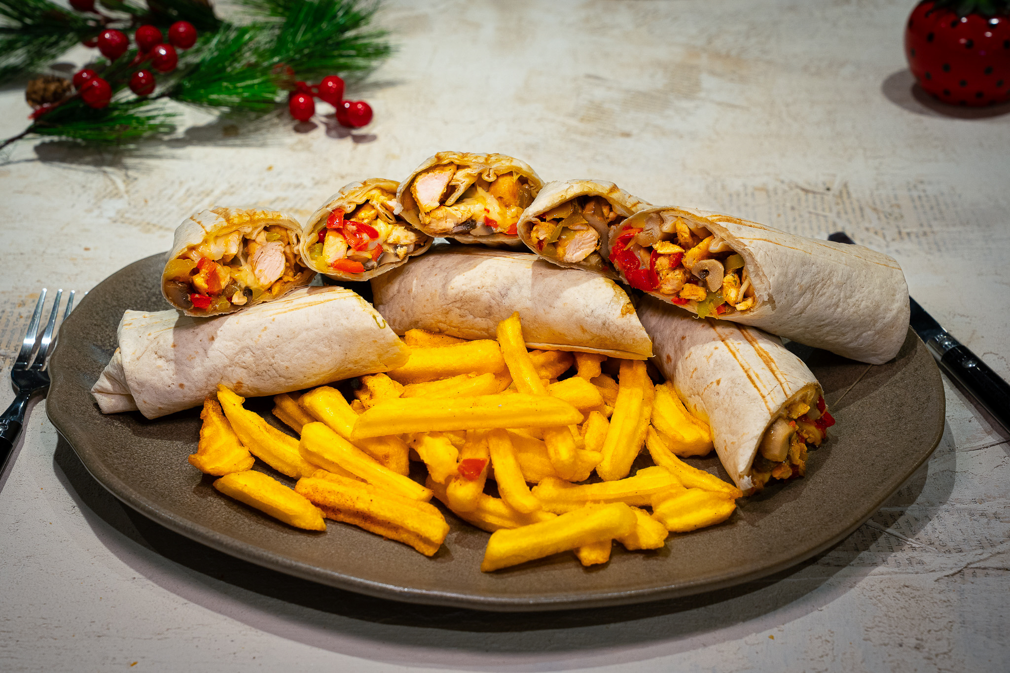 Tortilla ekmeğine sarılmış, pilav, salça ile kavrulmuş julyen tavuk, meksika fasulyesi, ekşi krema, kaşar peyniri, domates, soğan, köy biberi, iceberg marul ve akdeniz yeşillikleri ile