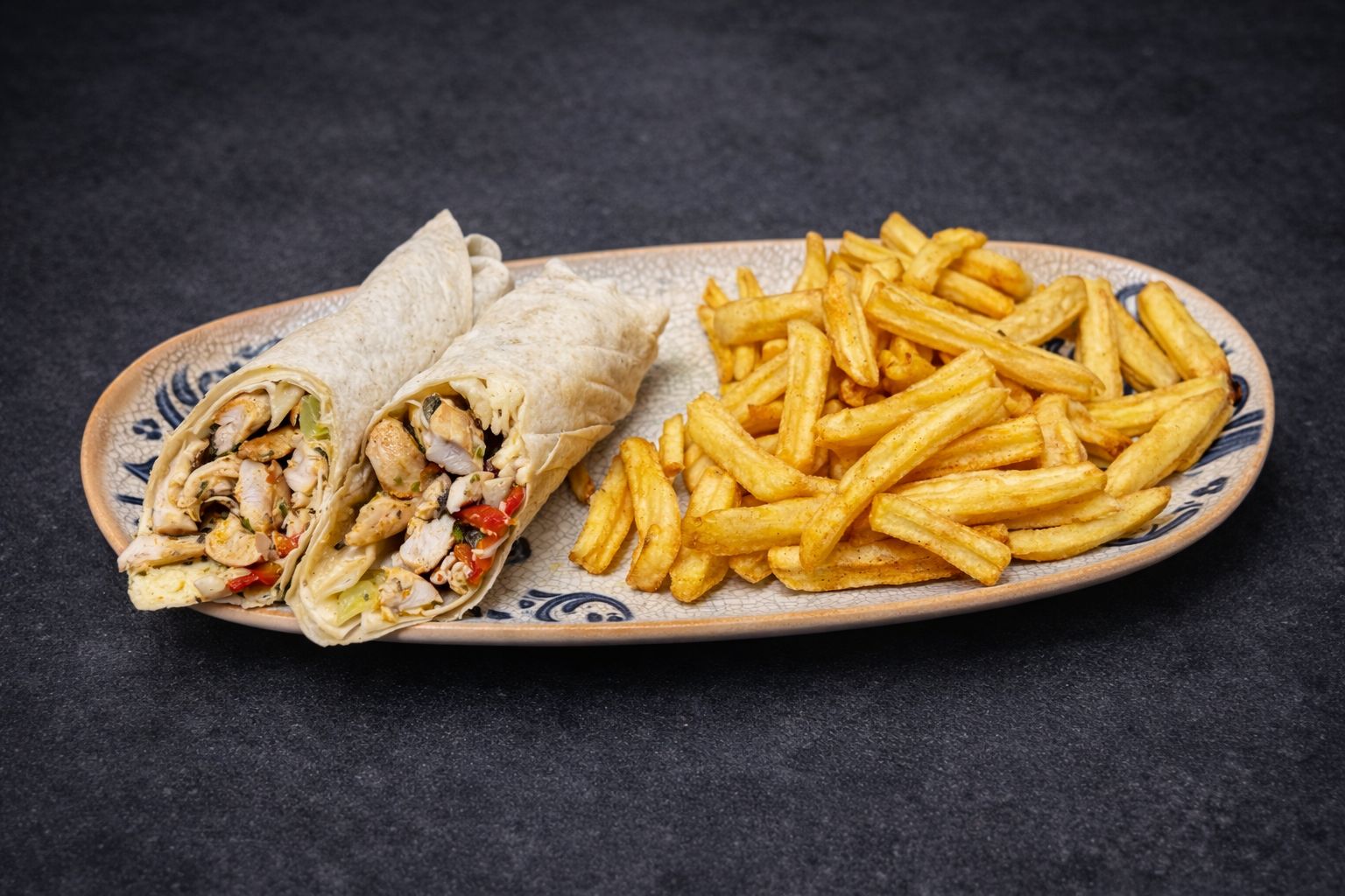 Tortilla Ekmeğine Sarılı, Sotelenmiş Pilav, Küp Tavuk Bonfile, Meksika Fasulyesi, Acı Sos, Sarımsak, Taze Soğan, Üzerine Domates Sos, Cheddar Peyniri, Yanında Patates Kızartması, Sezar Sos ile
